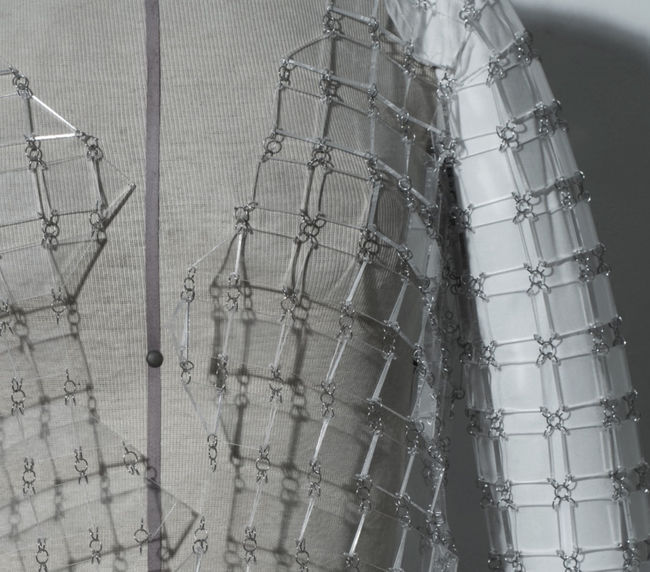 La Chaqueta de acrílico es un estudio del movimiento a través de piezas rígidas en la indumentaria. El resultado de mayor interés fue el acrílico ensamblado por alambre. Esta se compone de cuadrados de acrílico 1" x 1" con una profundidad de 1/8". Están unidos por argollas de alambre creando espacios negativos entre si que le permiten a la pieza adoptar la forma y permitir el movimiento del cuerpo.